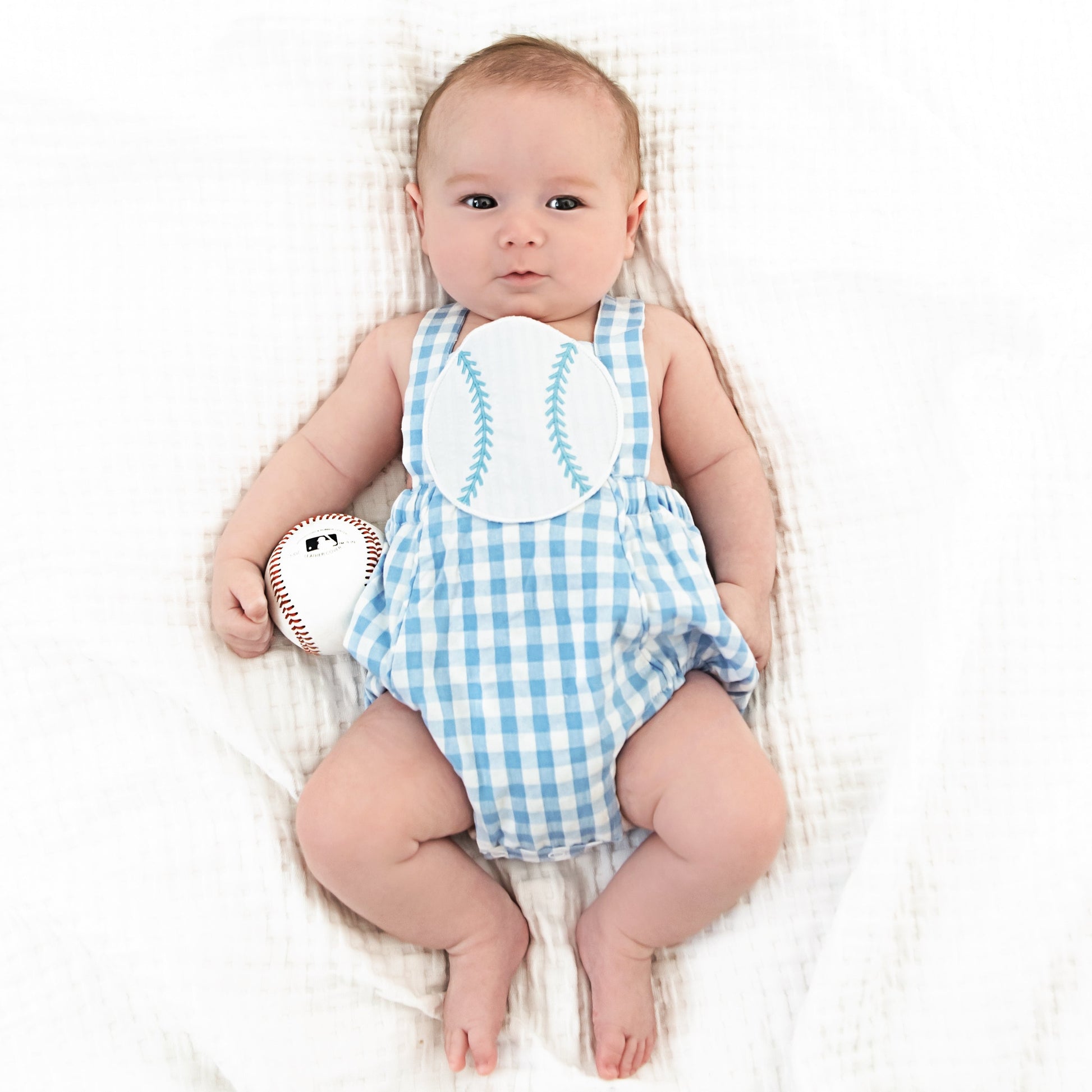 It's Game Time! Our Blue Baseball Sunsuit is perfect for your little Rookie Of The Year! The sunsuit features an oversized baseball applique on the chest and a matching baseball appliqué on the booty. Blue gingham fabric and adjustable criss-cross straps complete this adorable sunsuit.