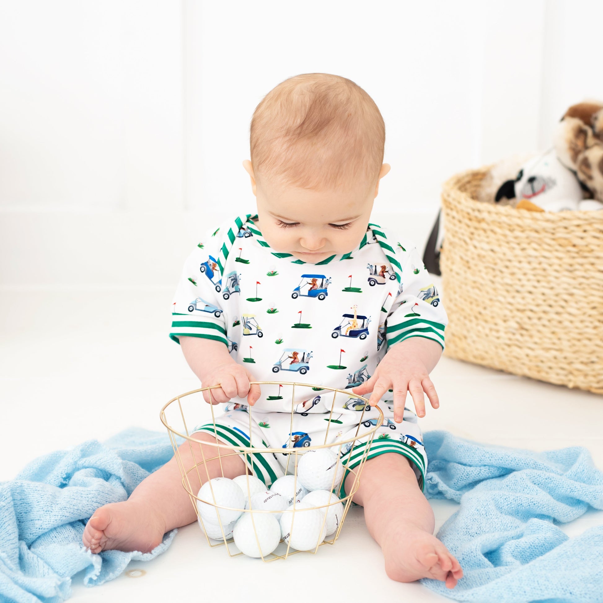 The Boys Fairway Shortie Golf Romper was designed in collaboration with the talented Katherine Herrell Studio. The super soft and comfy, Fairyway Shortie Romper is perfect for the country club or watching The Masters.
