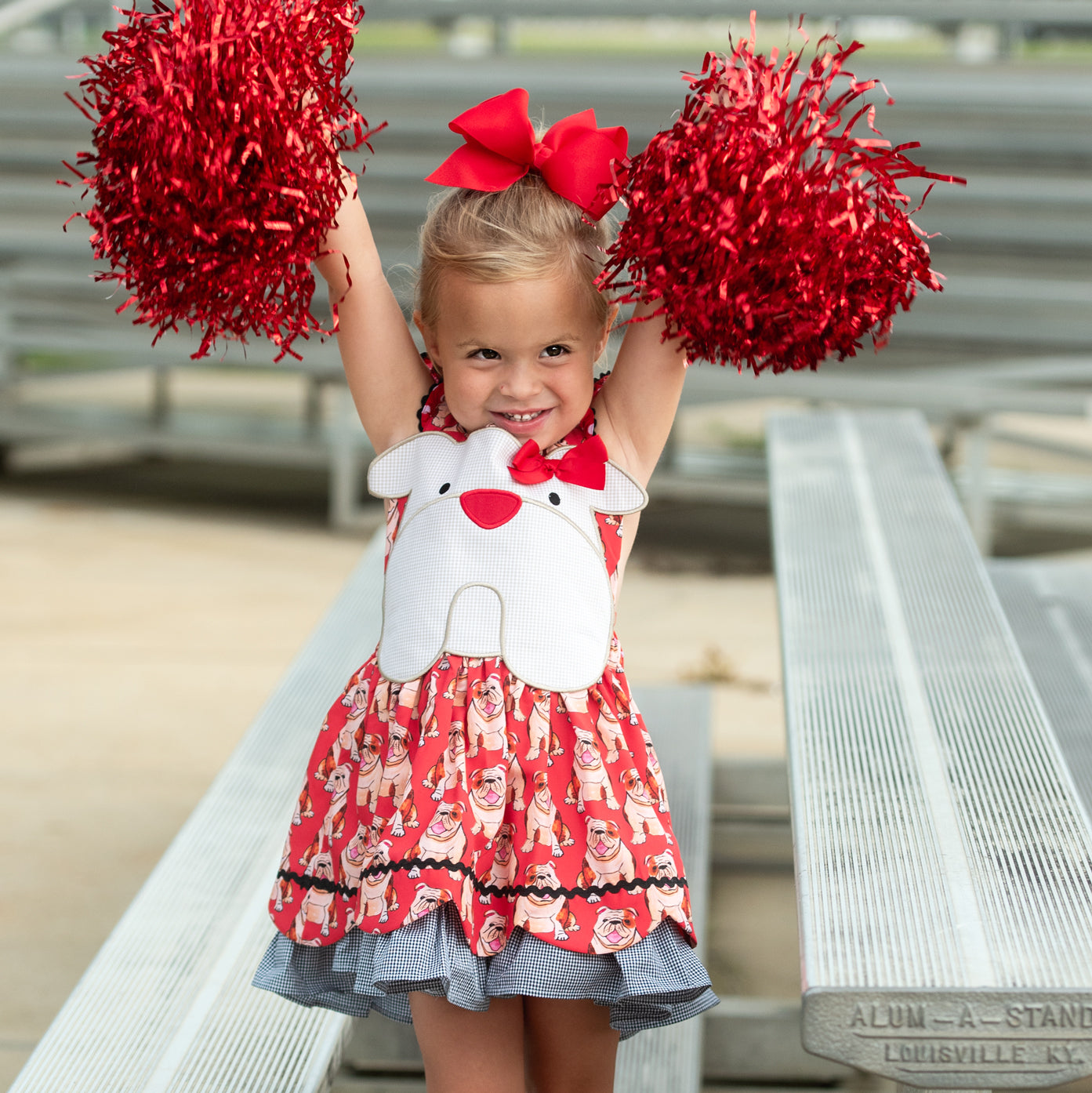Be GameDay ready for Saturdays in the South with our Bulldog Dress. This dress features our custom designed Bulldog GameDay print by the talented Katherine Herrell Studio. Adjustable criss-cross straps button in the back. Double layer skirt with scallop hemline and ruffle detail.