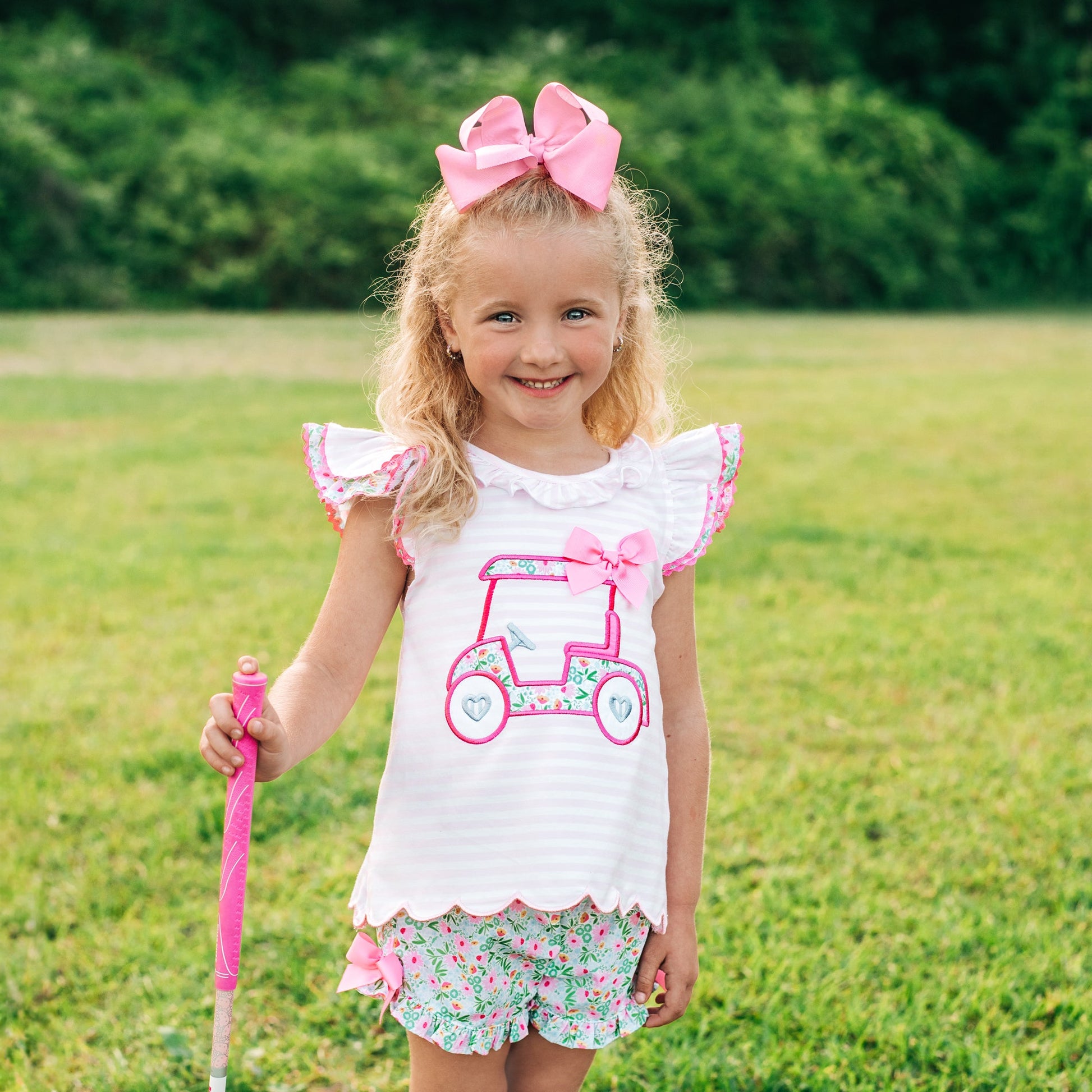 Cutest caddie at the club! Our Floral Golf Set features a soft knit top with an adorable golf cart applique, ruffled neckline and scallop hem. The coordindating shorts have an elastic waist and beautiful floral print.