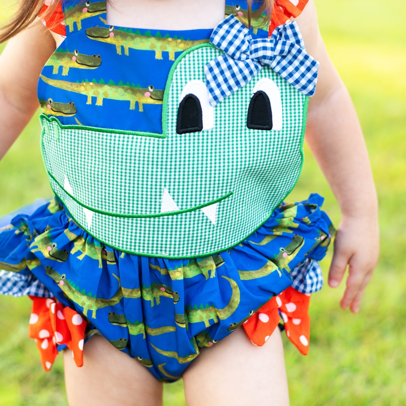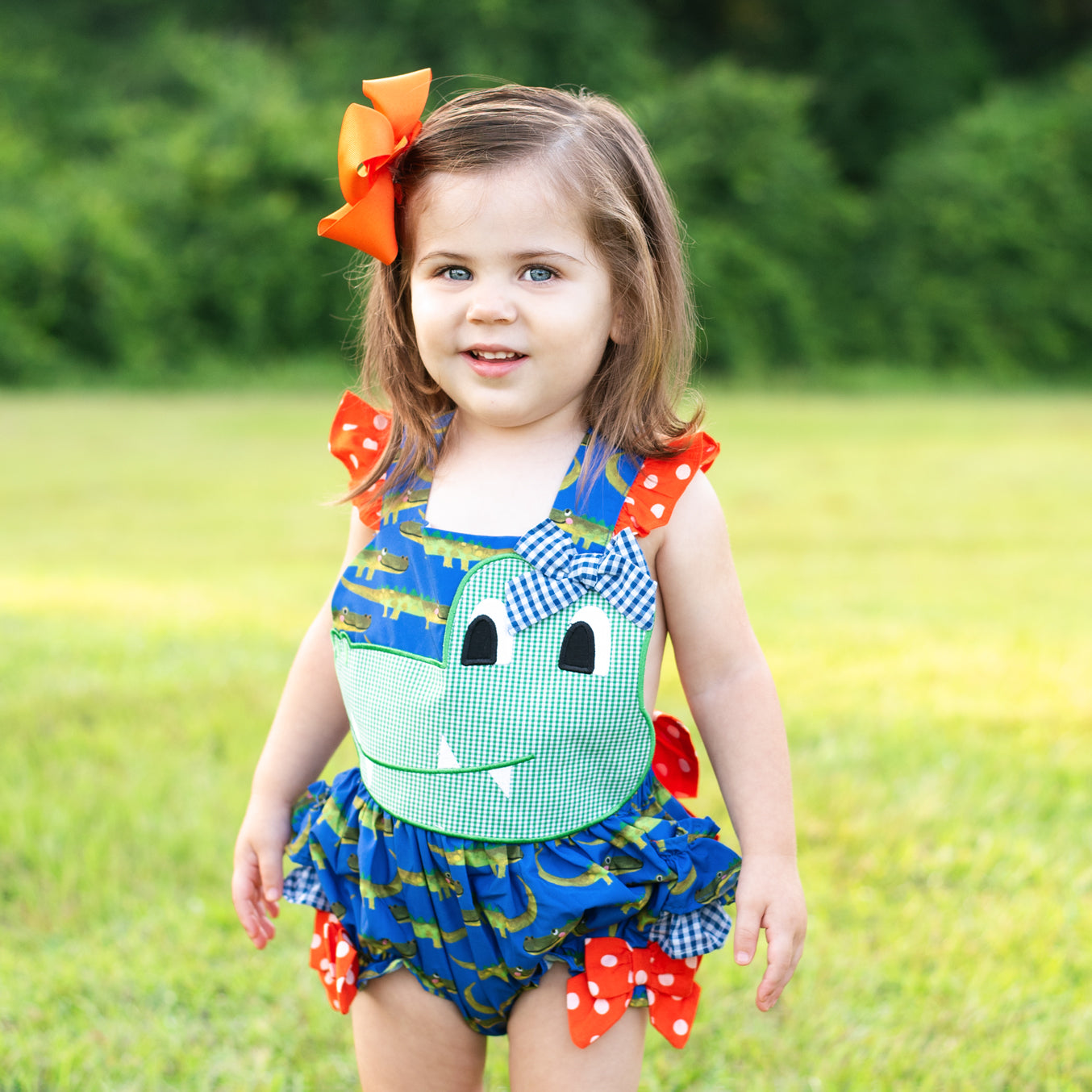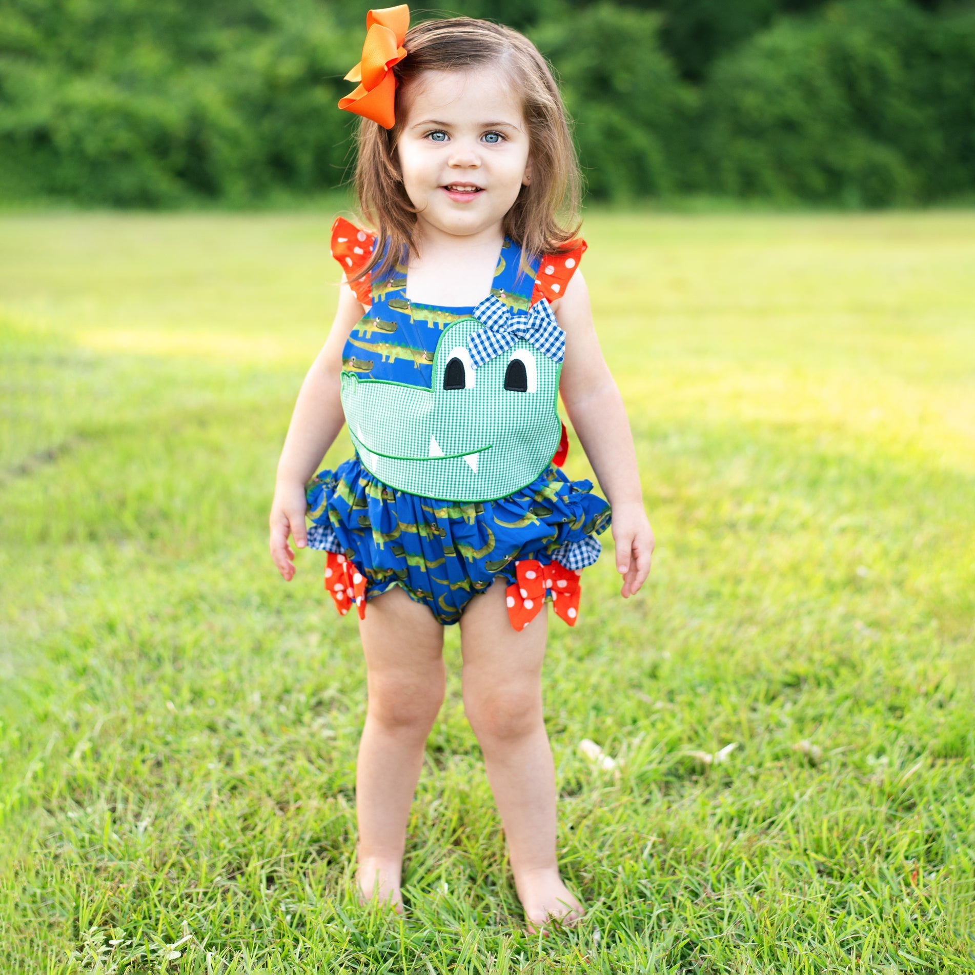 Be GameDay ready for Saturdays in the South with our Gator Bubble. This bubble features our custom designed Gator GameDay print by the talented Katherine Herrell Studio. Adjustable criss-cross straps button in the back.