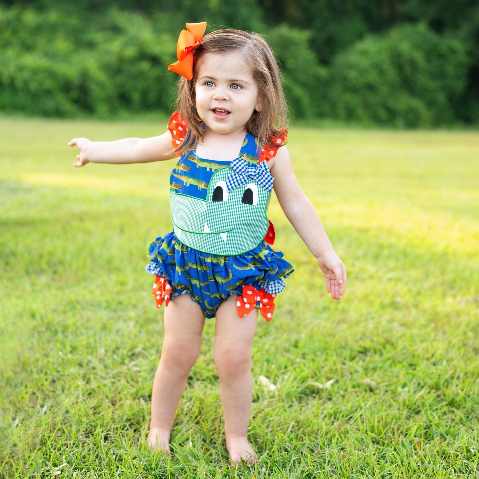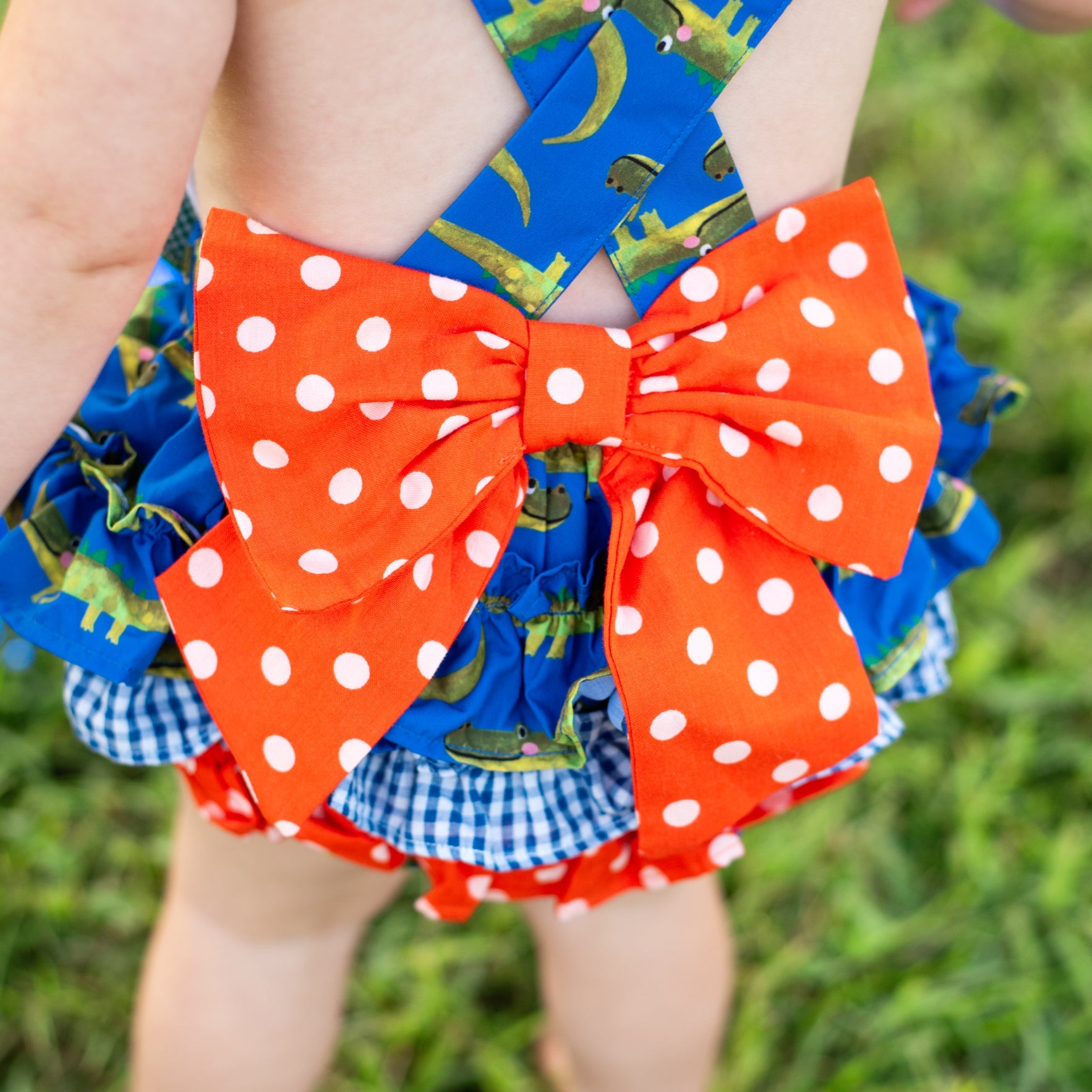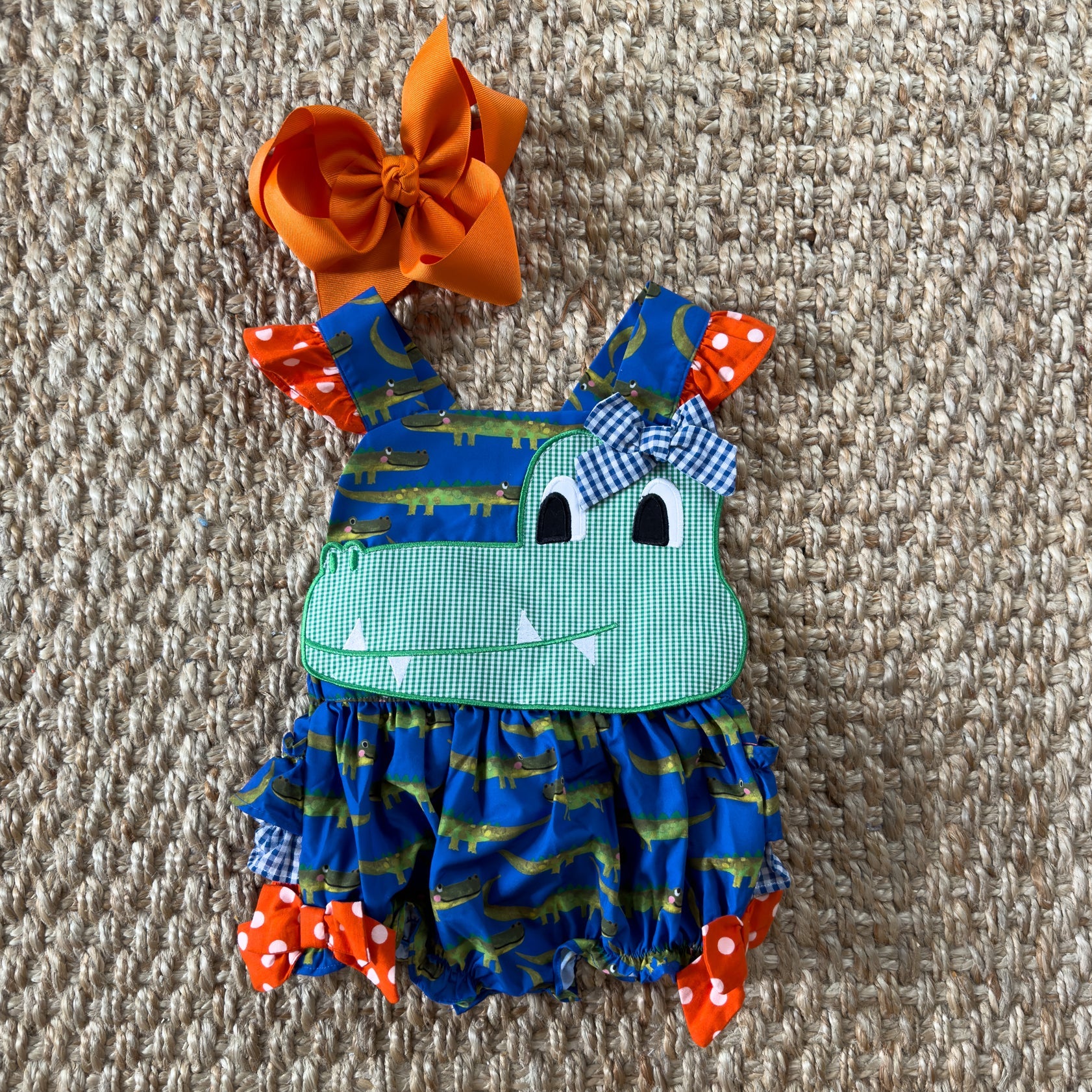 Be GameDay ready for Saturdays in the South with our Gator Bubble. This bubble features our custom designed Gator GameDay print by the talented Katherine Herrell Studio. Adjustable criss-cross straps button in the back.