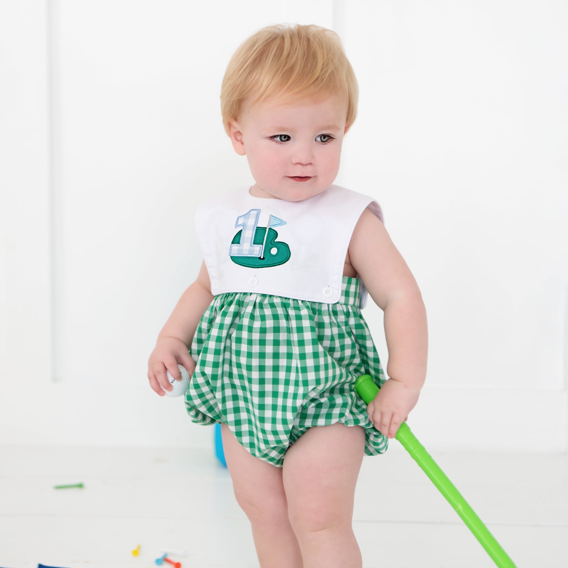 Birdies and eagles are fun but celebrating his birthday will be a hole-in-one! Our Reversible First Par-Tee Birthday Golf Bubble is two outfits in one. An applique "1" on a golf green reverses to a triple tee applique.