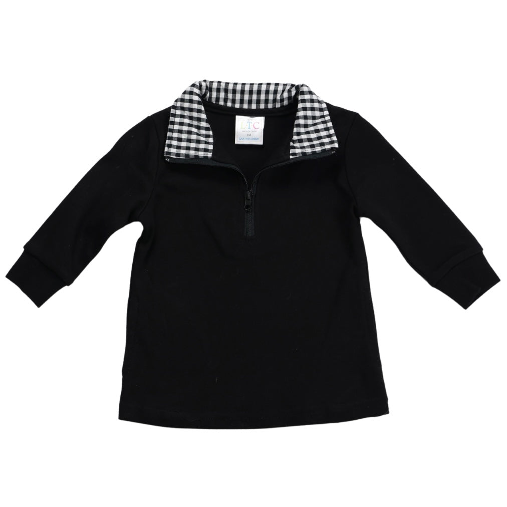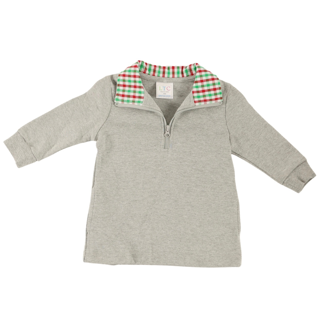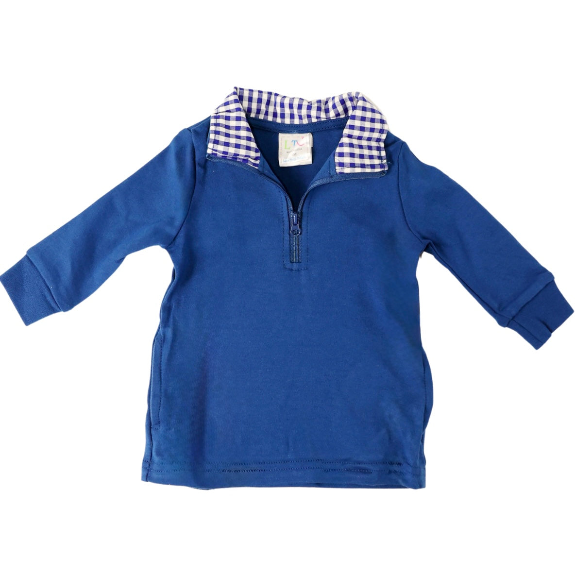 Stay cozy and stylish with our LTC ¼ zip pullover. Made of 100 percent interlock cotton, this pullover is comfortable and versatile. It features a 1/4 zip design, hidden pockets, and a double-stitched hem for durability. The ribbed cuffs on the sleeves add a trendy touch. The inside of the collar provides a pop of color, adding a special detail to this pullover. Mix and match it with our various bottoms for endless outfit options. Sign up for a wholesale account at Love That Cotton if you're a business. Shop now and elevate your little one's wardrobe with this must-have pullover.