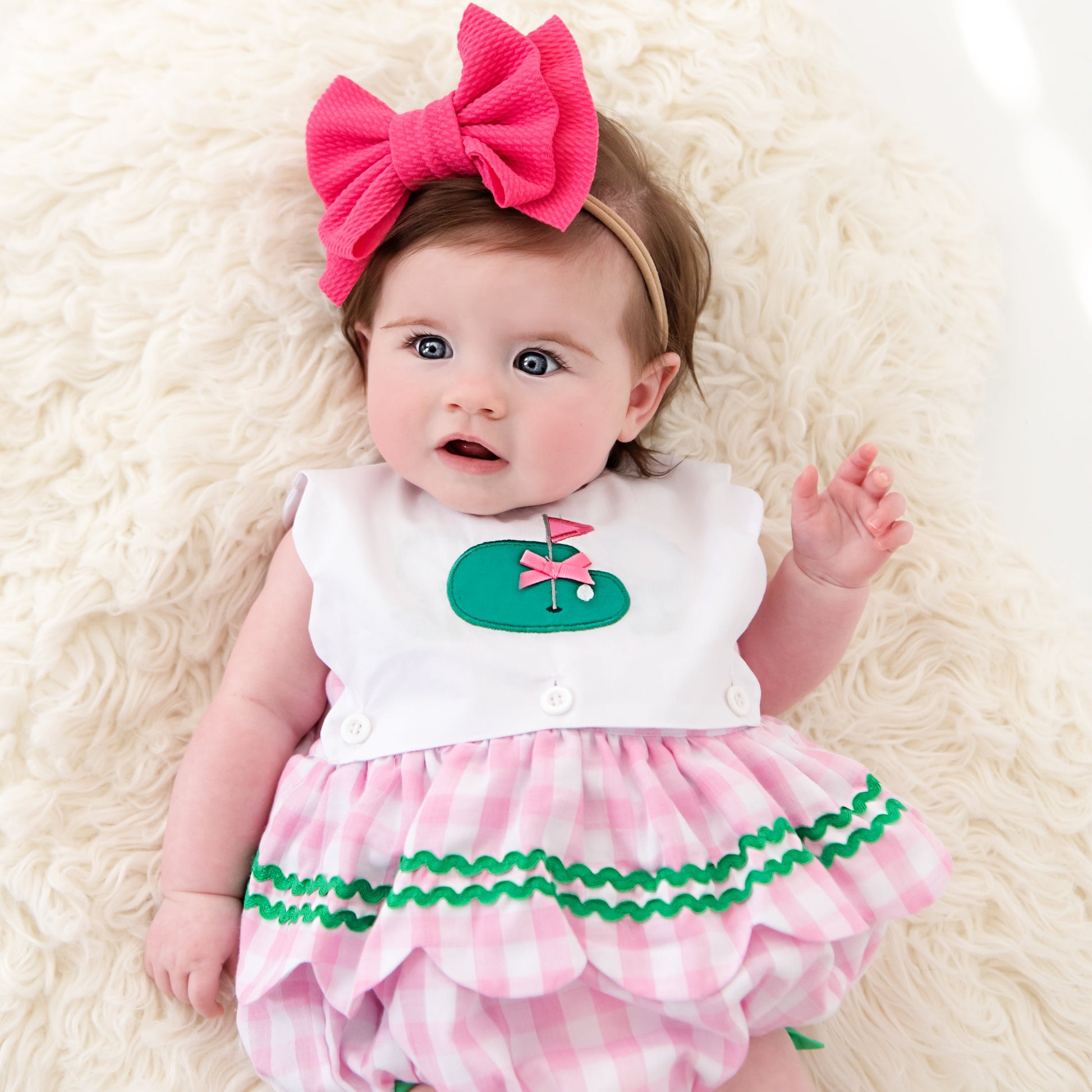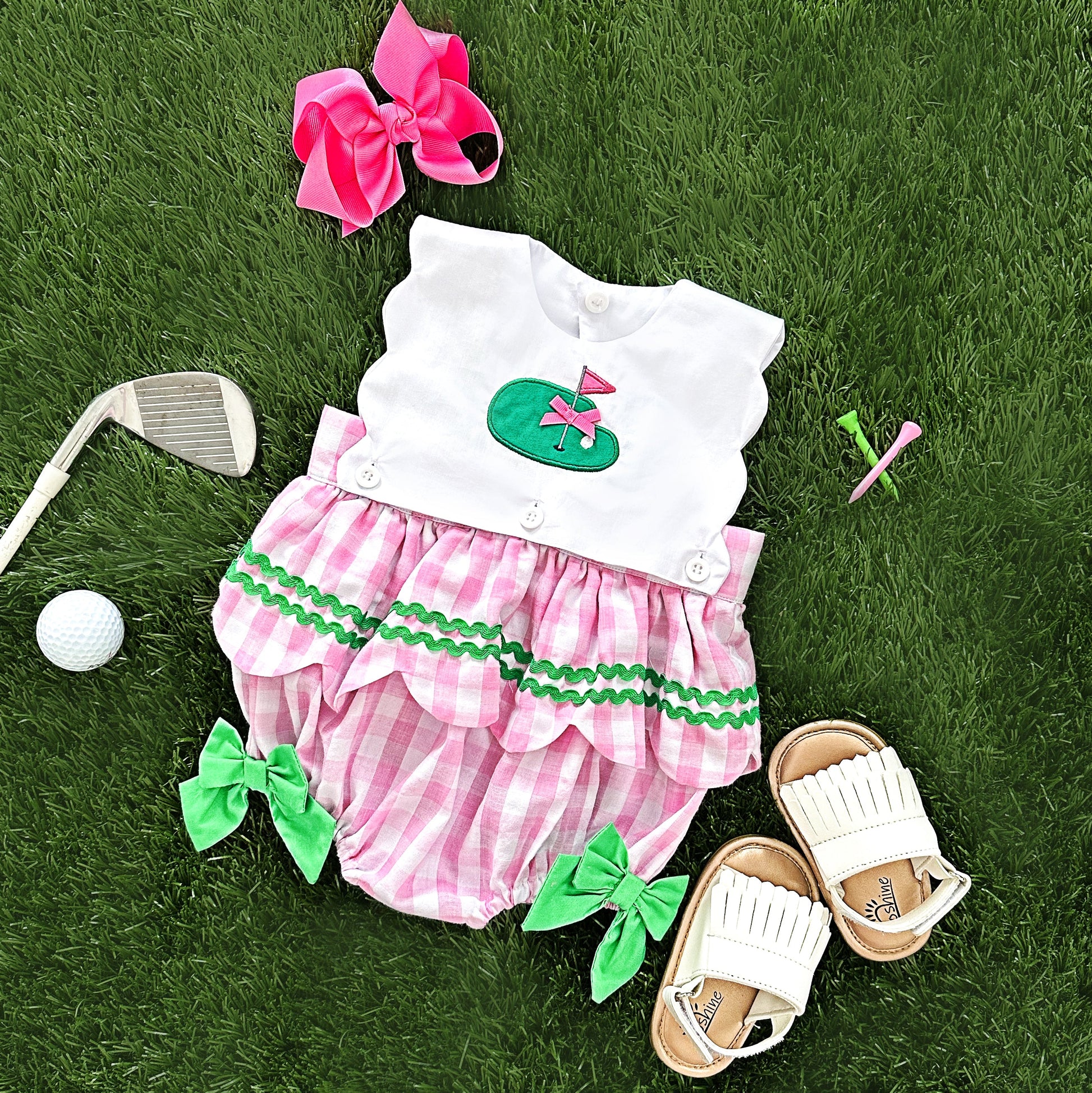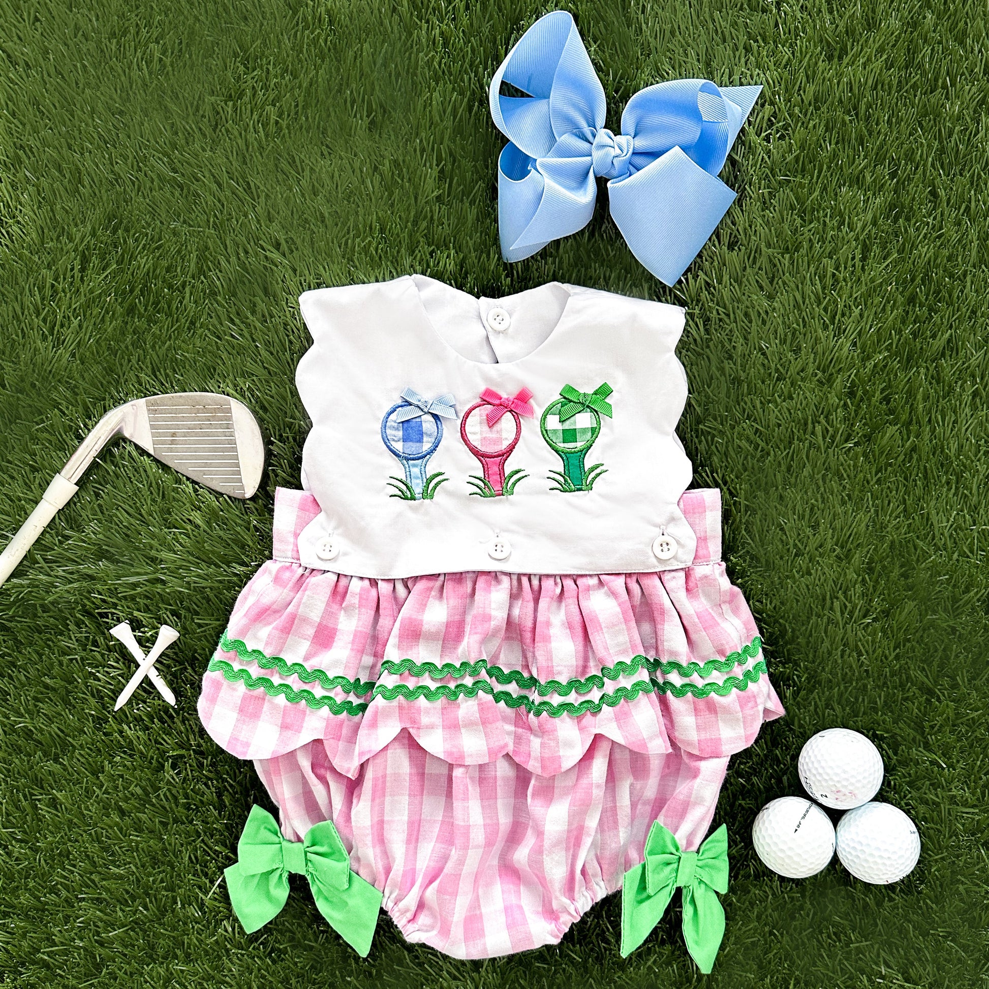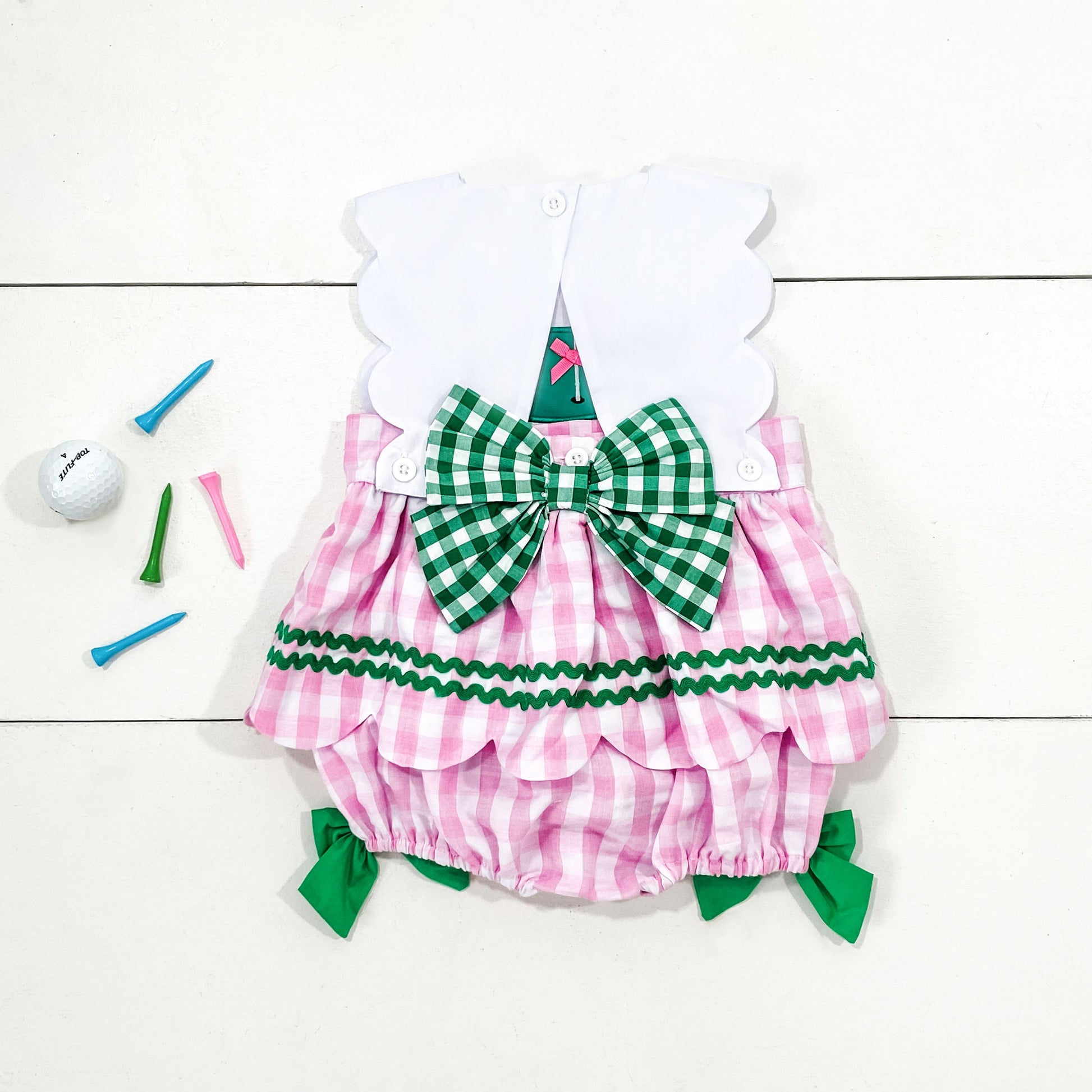 Two outfits in one! The Birdie Golf Bubble features a button on reversible bib top. Over the top girly details, sweet scallop edges and an abundance of bows make this the perfect bubble for your little golf fan!