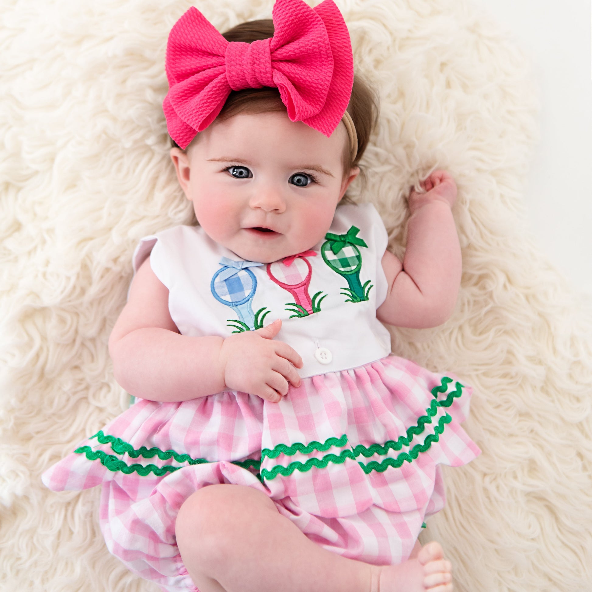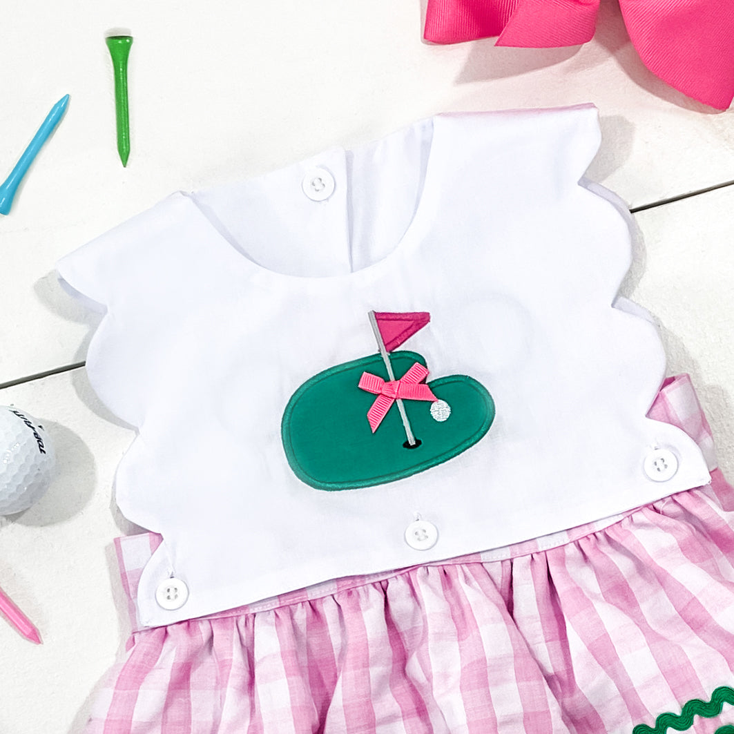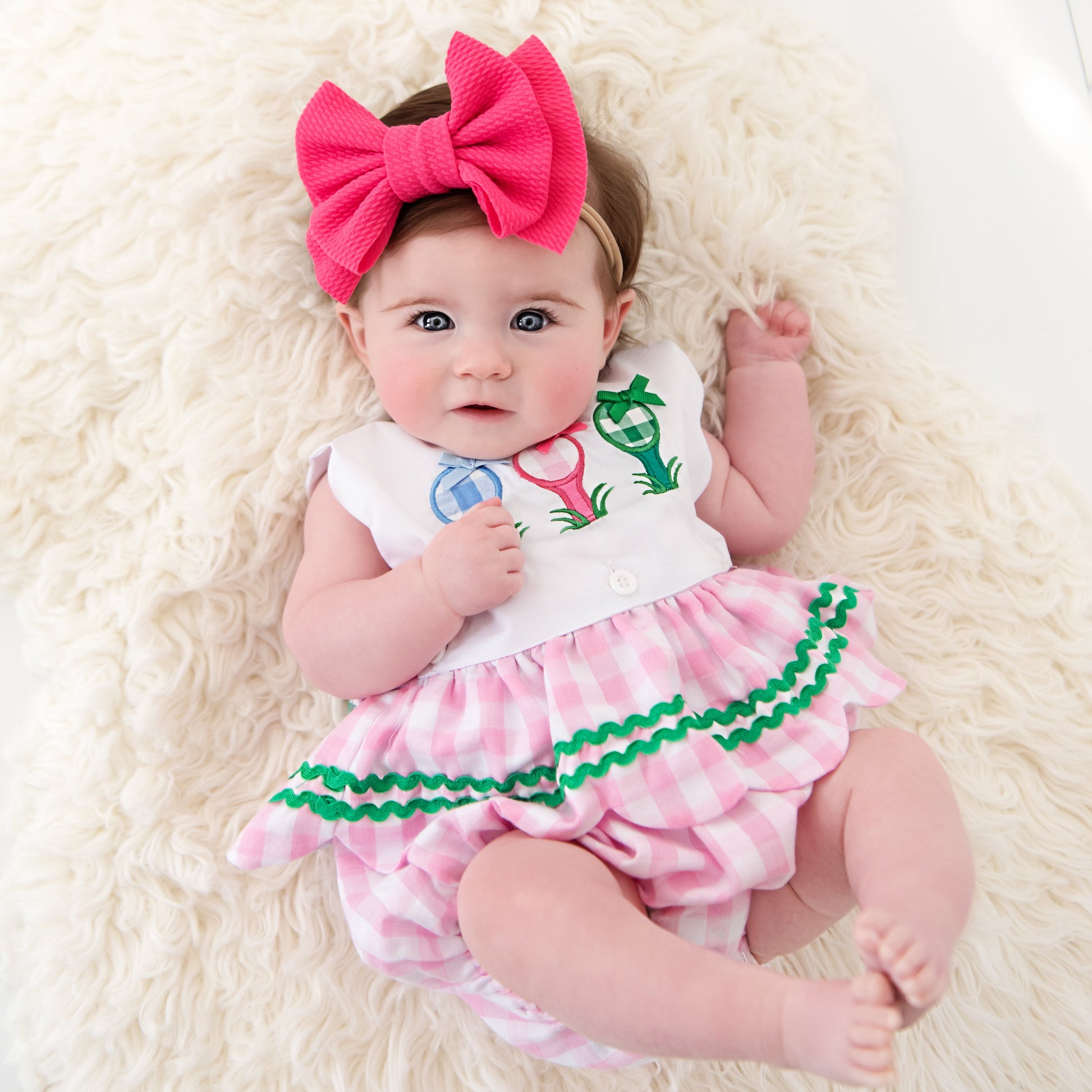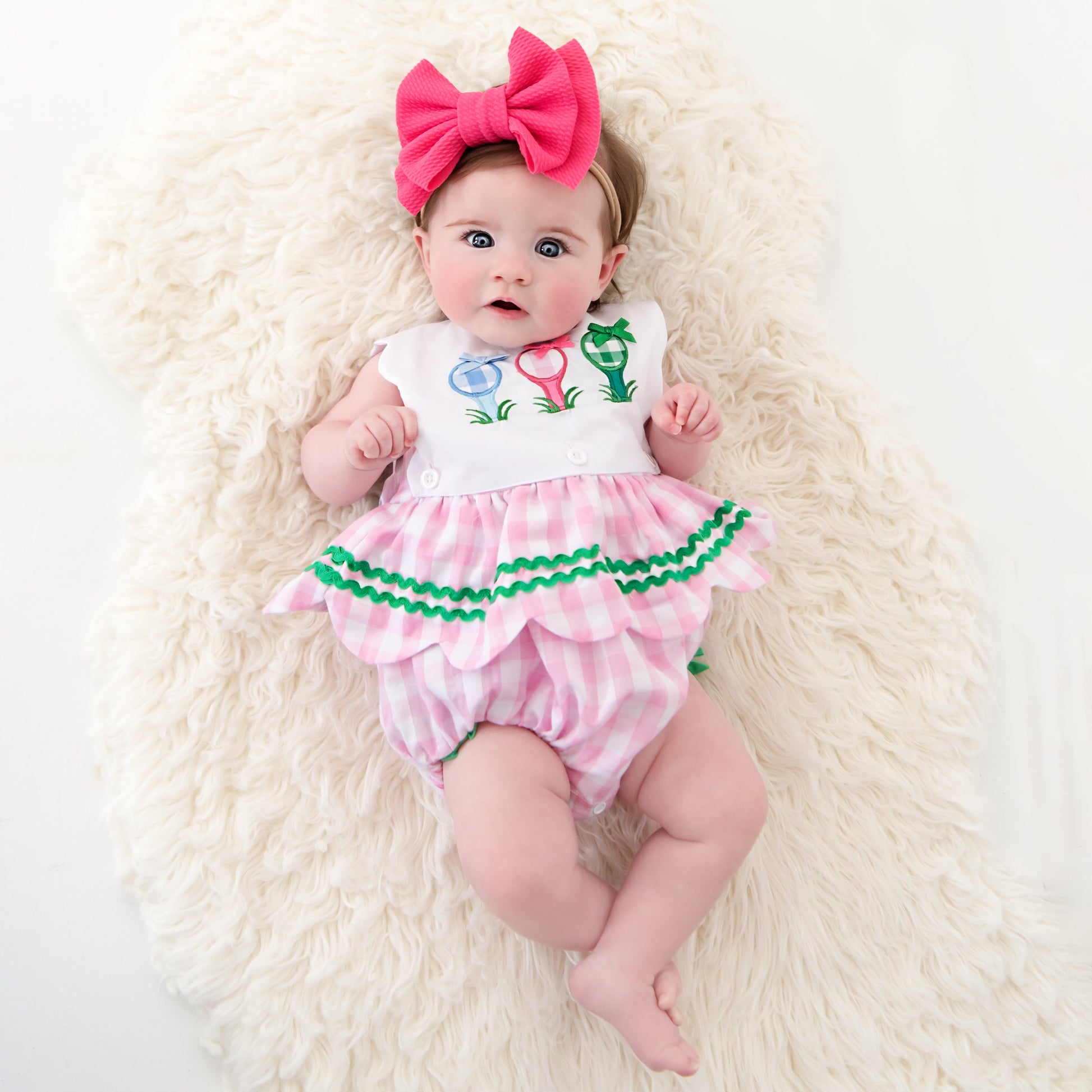 Two outfits in one! The Birdie Golf Bubble features a button on reversible bib top. Over the top girly details, sweet scallop edges and an abundance of bows make this the perfect bubble for your little golf fan!