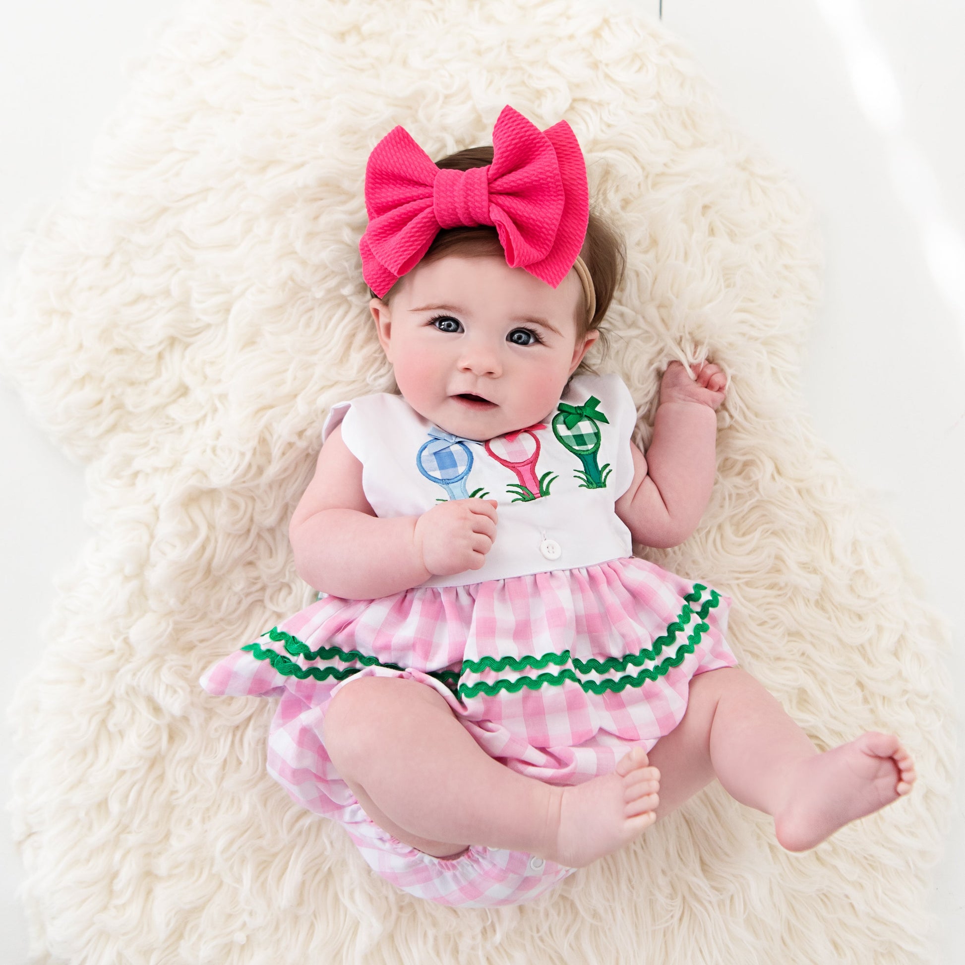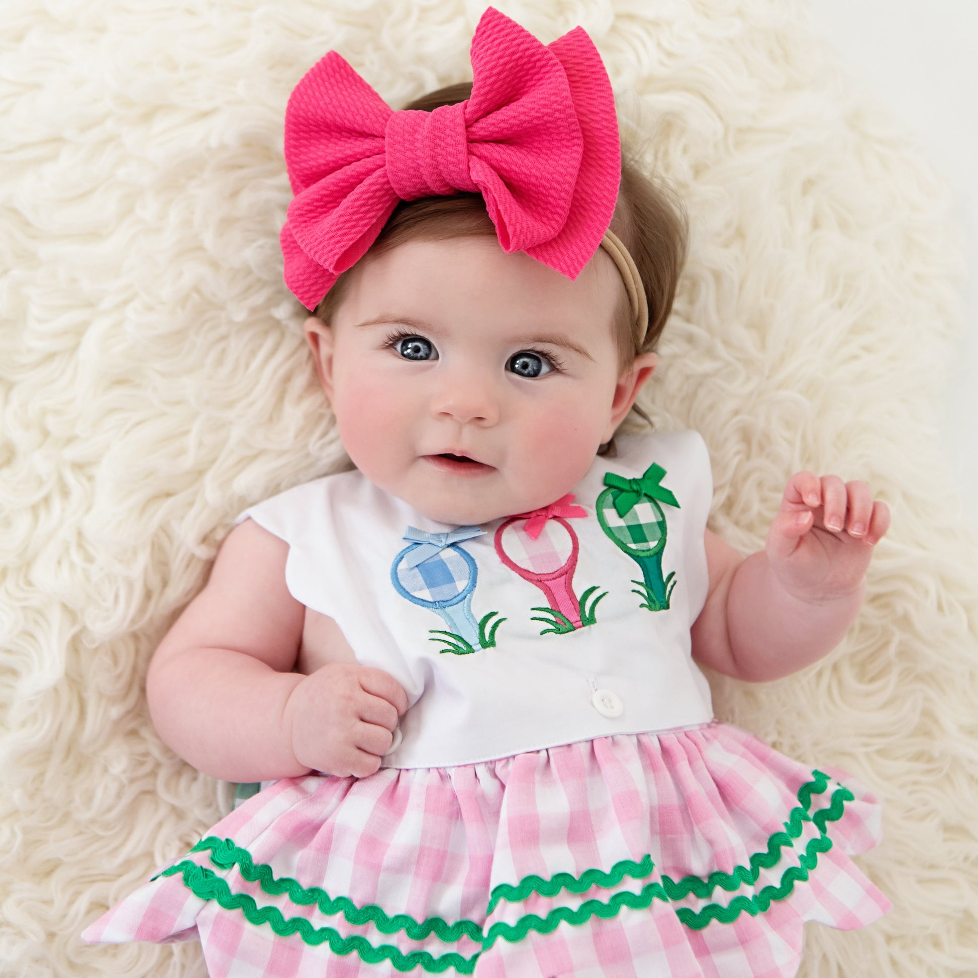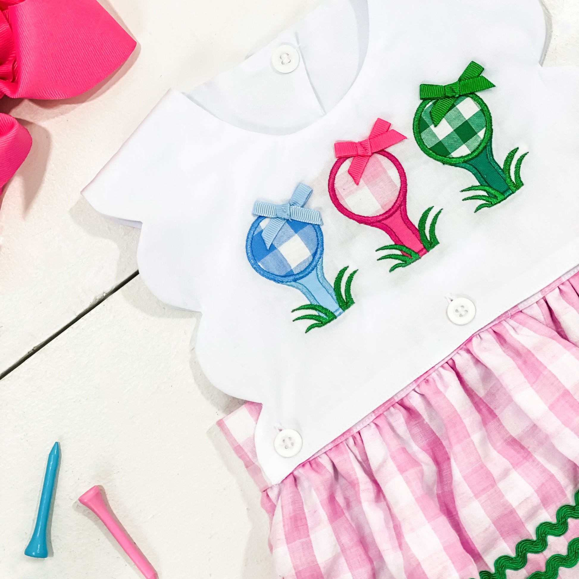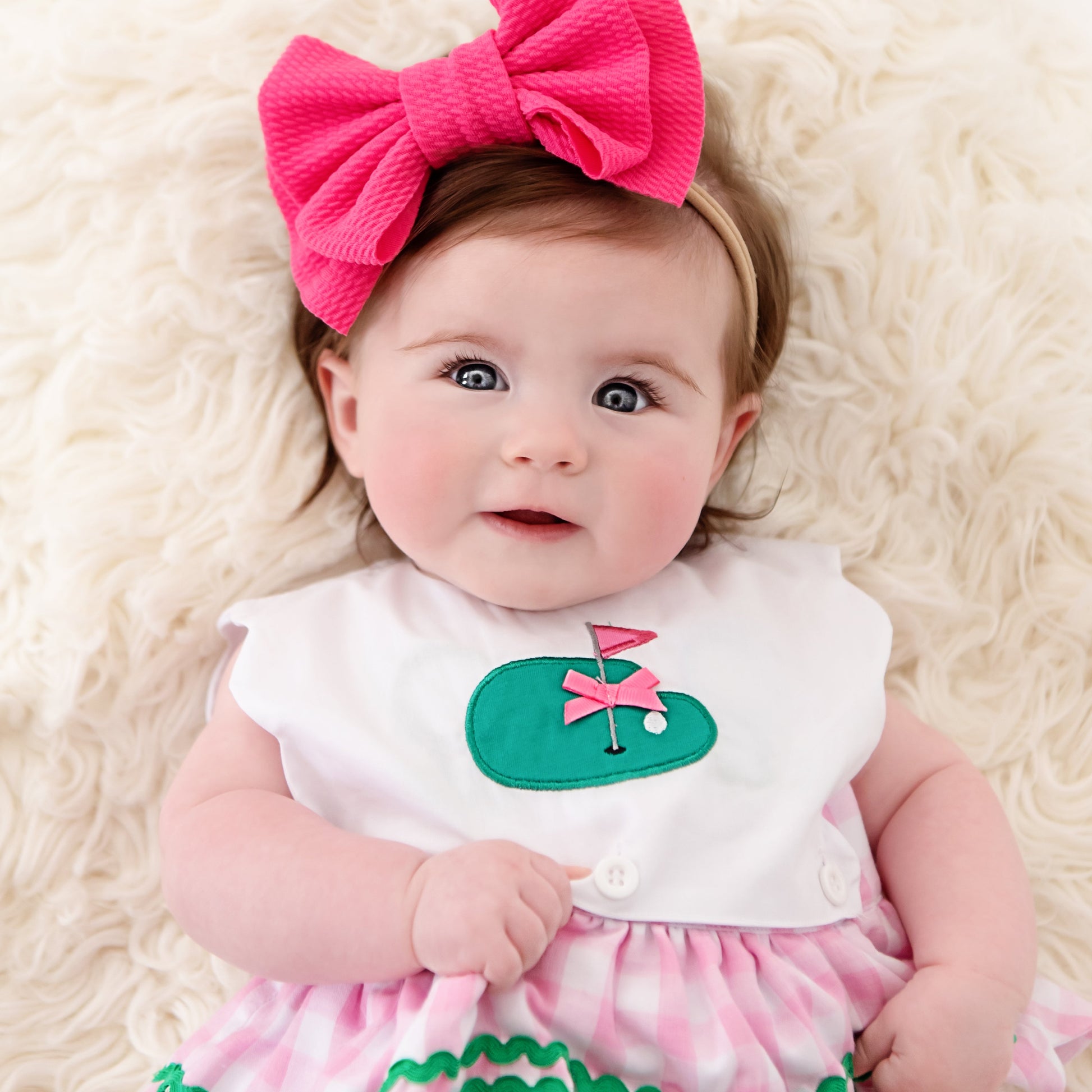 Two outfits in one! The Birdie Golf Bubble features a button on reversible bib top. Over the top girly details, sweet scallop edges and an abundance of bows make this the perfect bubble for your little golf fan!