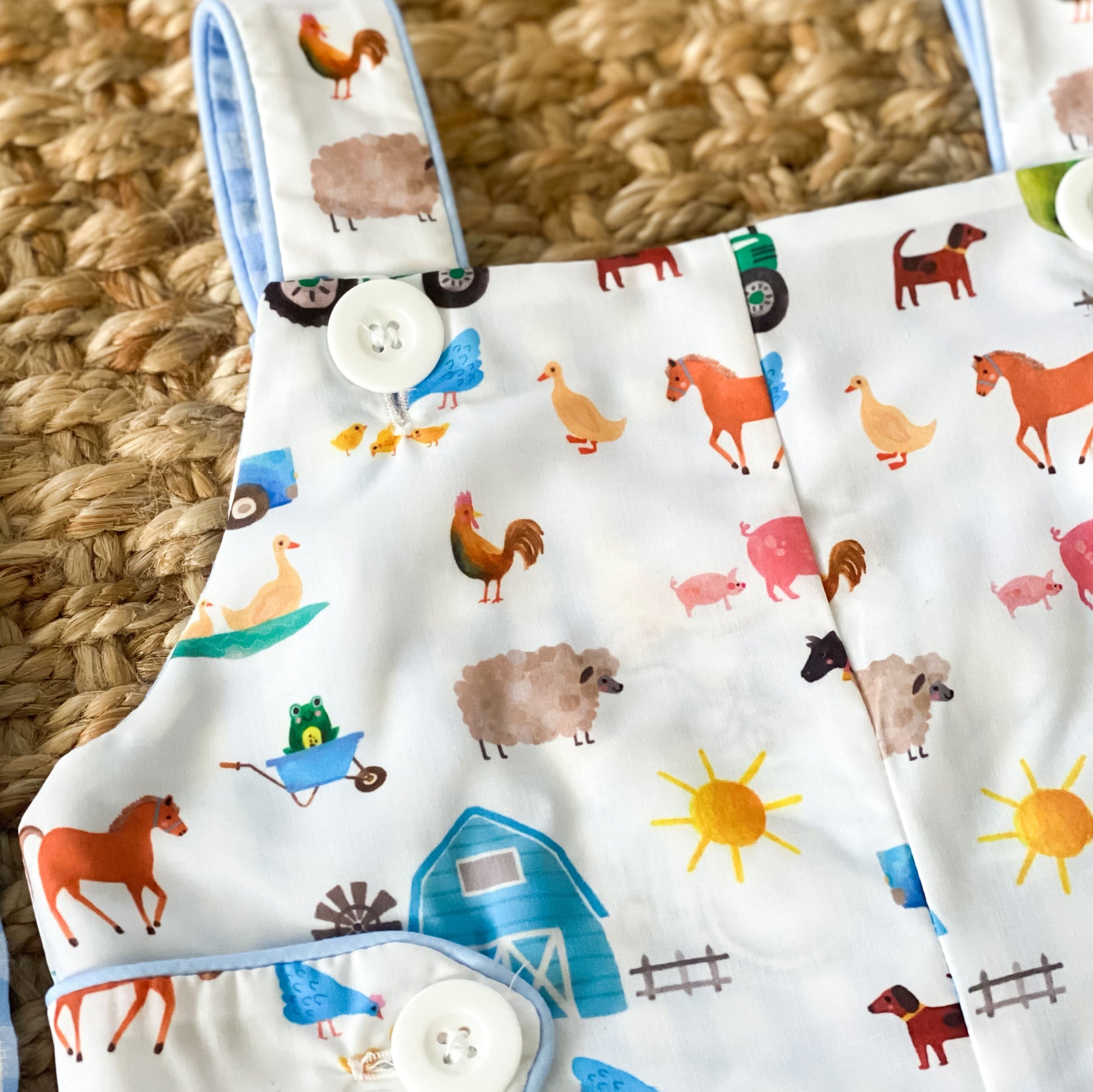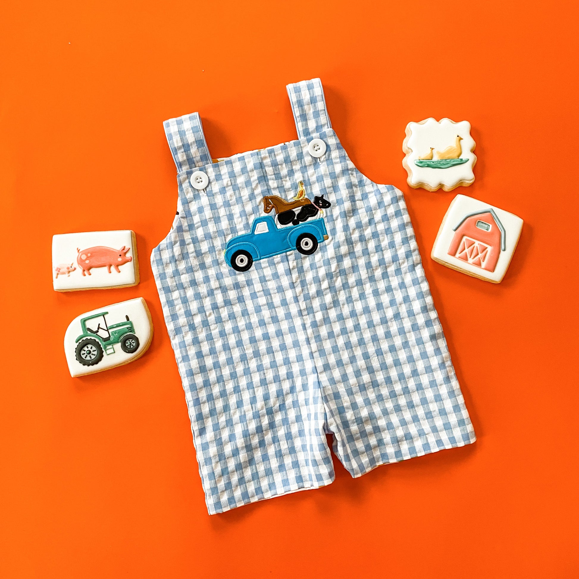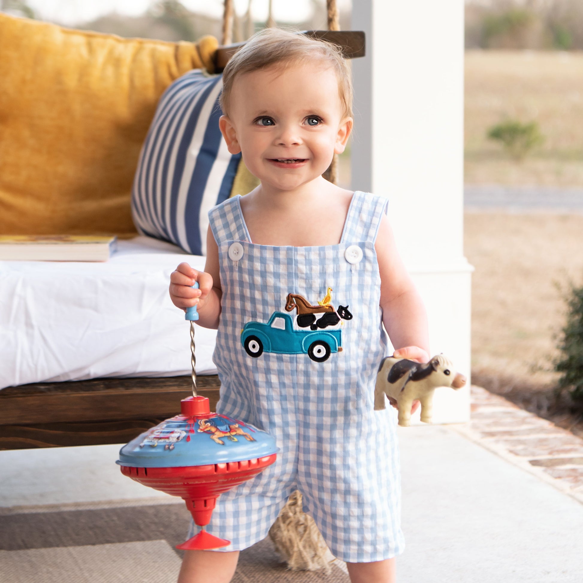 Two outfits in one! The Reversible Farm Truck Jon Jon features the custom Barnyard & Bows print designed by the talented Katherine Herrell Studio. The Jon Jon reverses to an adorable little blue farm truck applique on blue gingham.